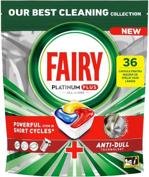 Fairy Platinum Plus Anti Dull automata mosogatógép kapszula, 36 mosás Az Anti-dull technológiának köszönhetően eltávolítja a matt megjelenést, hogy az edények eredeti fényét visszaadja. A Fairy Platinum Plus mosogatógépkapszula újszerű tisztítást és a Fairy legjobb kemény élelmiszertisztító alapanyag-kollekcióját kínálja, sőt, segít eltávolítani az idővel kialakult matt hatást, hogy az edények eredeti fényét visszaadja. Segít eltávolítani a zsírt a mosogatógép szűrőjéből. Ultralágyuló bevonata gyorsan oldódik, így gyorsan elkezd tisztítani, hogy elvégezze a munkáját. És nagyon egyszerű a használata! Nem kell kicsomagolni, csak helyezze a mosogatógép mosogatószer-adagolójába. A mosogatógépgyártók által ajánlott márka.