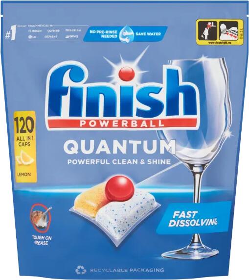 A Finish Quantum kiváló tisztaságot és ragyogást biztosít, valamint további védelmet nyújt az üvegkorrózió ellen. A Finish Powerball elmossa a maradékot a ragyogás érdekében, még a legnehezebb vízviszonyok között is. A Finish Quantum újrazárható zacskóban kapható, így nincs szükség az egyes kapszulák kicsomagolására.