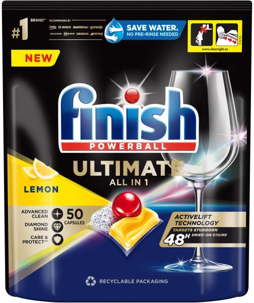 Finish Ultimate All in 1 mosogatógép kapszula, Citrom illat, 50 dbFinish Ultimate a makulátlanul tiszta és csillogó edényekért már az első használattól kezdve, minden alkalommal. Az ACTIVELIFT TECHNOLOGY formulának köszönhetően, hatékonyan távolítja el a legmakacsabb ételmaradékokat is akár 24 óra elteltével, előáztatás nélkül. A kapszula védi és tisztán tartja az üvegedényeket és evőeszközöket is, megőrizve csillogásukat minden mosogatás után. A leghatékonyabb teljesítményű kapszulánk, amely átlagosan 15%-kal kevesebb vegyi anyagot tartalmaz, mint a Finish Power tabletta. TermékjellemzőkFolyékony Powerball: csillogó ragyogást biztosít. Gél: a hatékony zsíroldó gél a legmakacsabb szennyeződésekkel is szembeszáll. Por: előáztató és súroló por a rátapadt ételmaradék eltávolítására. Activblu Technology: felerősíti az Ultimate tisztító hatást. Kellemes, friss illat. Megakadályozza a vízkő lerakódását. Képes megbírkózni az odaégett ételmaradékokkal. Eltávolítja az összes szennyeződést és zsírt az edényekről. Folyékony powerball. Activelift technológia. Alacsony hőfokon is hatásos. Szuper ragyogás. Védelmet nyújt a mosogatógép számára. Az edények tökéletesen tiszták, a poharak pedig fényesek lesznek. Csomagolásmentes, biológiailag lebomló, 100%- ban vízben oldódó bevonattal. Hogyan használja?Csak száraz kézzel fogja meg. Ne tépje szét. Ne csomagolja ki a kapszulát, mivel mosogatás alatt teljesen feloldódik. Mosogatásonként egy kapszulát helyezzen be a SZÁRAZ adagoló tartályba. Ne tegye a kapszulát az evőeszköztartóba. A legjobb eredmény érdekében használja gazdaságos/eco vagy automata programon. A kapszula só funkciója lágy/közepesen kemény és kemény vízben 26şe vízkeménységi fokig fejti ki hatását. Ha a víz nagyon kemény, akkor a jobb hatás érdekében adjon hozzá Finish vízlágyító sót. Az Ultimate kapszulák minőségének megőrzése érdekében, használat után mindig zárja vissza a csomagot és tárolja hőtől és nedvességtől védett helyen. A legjobb száradási eredményhez Finish Rinse Aid gépi öblítőszer használatát ajánljuk. Ez a csomagolás újrahasznosítható, helyezze szelektív hulladékgyűjtőbe, ha teljesen kiürült a csomagolás. ÖsszetevőkÖsszetevők: 15-30 % nem ionos felületaktív anyagok; 5-15 % oxigén alapú fehérítőszerek, polikarboxilátok, foszfonátok. Enzimeket tartalmaz (szubtilizin, amiláz) és illatszereket (BENZYL BENZOATE, GERANIOL). A márkárólSenki sem szeret mosogatni. Ezért találtuk fel a gépi mosogatószereket a mosogatógép-gyártókkal karöltve még 1953-ban. Megszállottan