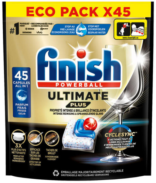 Élvezd a ragyogó tisztaságot és a hosszan tartó frissességet a Finish Ultimate Plus All in 1 mosogatógép tablettákkal! Az innovatív CycleSync technológia gondoskodik arról, hogy minden összetevő a megfelelő időben fejtse ki hatását, így edényeid mindig makulátlanok és fényesek lesznek. Speciális formulája még az odaégett ételmaradékokkal és a zsíros szennyeződésekkel is felveszi a harcot, miközben kellemes illattal tölti meg a mosogatógépet.