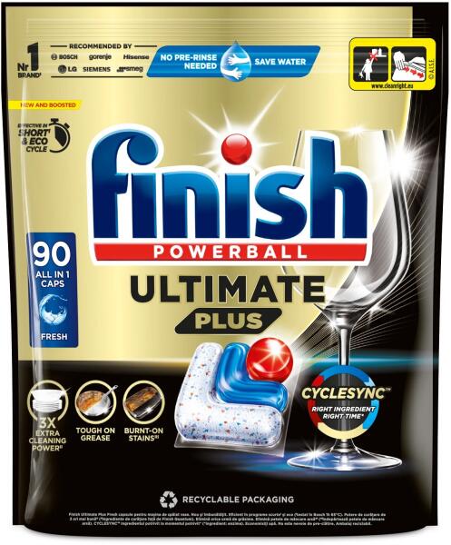 Finish Ultimate Plus Fresh mosogatógép kapszula, 90 db A Finish Ultimate Plus minden egyes használatkor intenzív tisztaságot és tökéletes ragyogást biztosít edényeinek. Az első Finish kapszula Cyclesync technológiával a megfelelő összetevőt a megfelelő időben bocsátja ki a mosogatási ciklus során, négy különböző fázisban adagolva azokat. A kapszulák kíméletesen védik a poharakat és az evőeszközöket, megőrizve ragyogásukat mosásról mosásra. Fejlett hatóanyagai eltávolítják még az odaégett ételmaradványokat is, így nincs szükség előöblítésre. Hatékony rövid mosogatási programokban is.