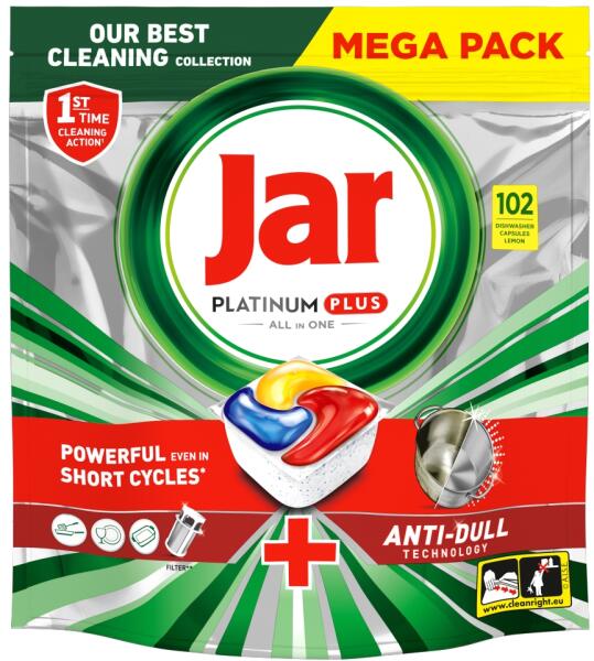 A Jar Platinum Plus All-in-One automata mosogatógép kapszulák újszerű tisztává varázsolják edényeit, garantálva a Jar legjobb tisztítóteljesítményét, sőt, segítenek eltávolítani az idővel kialakuló szürkés foltokat és visszaállítani az edények eredeti fényét. A Jar Platinum Plus kapszulák beépített előmosó rendszerrel rendelkeznek, így nem kell külön elmosogatnia az edényeket. A Jar Platinum Plus kapszulákkal nem kell előmosnia az edényeket, így több vizet takarít meg, és kíméli a környezetet. A Jar egyetlen hatékony kapszulában egyesíti a folyékony és a por állagú mosogatószert. A könnyen oldódó csomagolás gyorsan feloldódik, és rövid ciklusok esetén is jól működik, így az edények azonnal elkezdenek mosogatni. A kapszulák pedig nagyon könnyen használhatóak. Nem kell kicsomagolni a kapszulát, csak helyezze a mosogatószer-adagolóba . Az üveg a leghatékonyabb módja a makacs ételmaradékok eltávolításának , így az edények olyan tiszták lesznek, mint újkorukban Eltávolítják az idővel