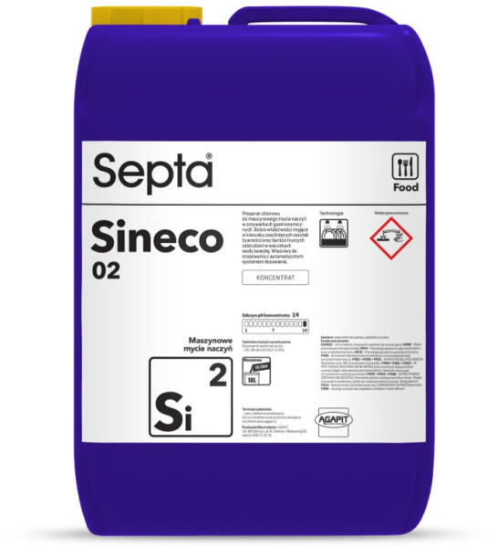 A Septa Sineco 02 SI2 a vendéglátóipari mosogatógépekben történő gépi mosáshoz való készítmény. Jó tisztító tulajdonságokkal rendelkezik a megszáradt ételmaradékokkal és a nagyon zsíros szennyeződésekkel szemben kemény vízben. Alkalmas automatikus adagolórendszerrel történő használatra. Tisztítási/hígítási technika:Automatikus adagolás- 20-30 ml/10 l (0,2-0,3%)Elérhető kiszerelések: 5 l, 10 l, 20 l