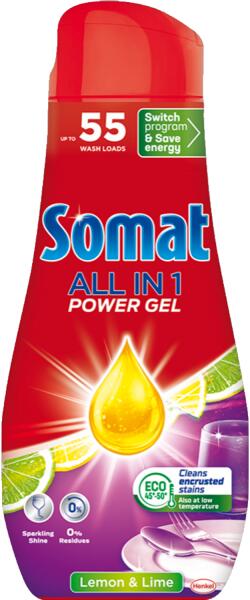 Somat All in 1 Gél - multifunkcionális gélünk, mely hatékonyan tisztít és csillogó edényeket biztosít alacsony hőmérsékletű eco és alacsony hőmérsékletű rövid mosogatási programokban is. Sokoldalú aktív formulája azonnal feloldódik és kifejti erőteljes tisztító hatását minden típusú szennyeződésen. Mosogatószer maradvány nélkül eco és rövid programokban is - nem hagy maga után mást, csak tiszta és fényes edényeket kellemes citrus illattal.