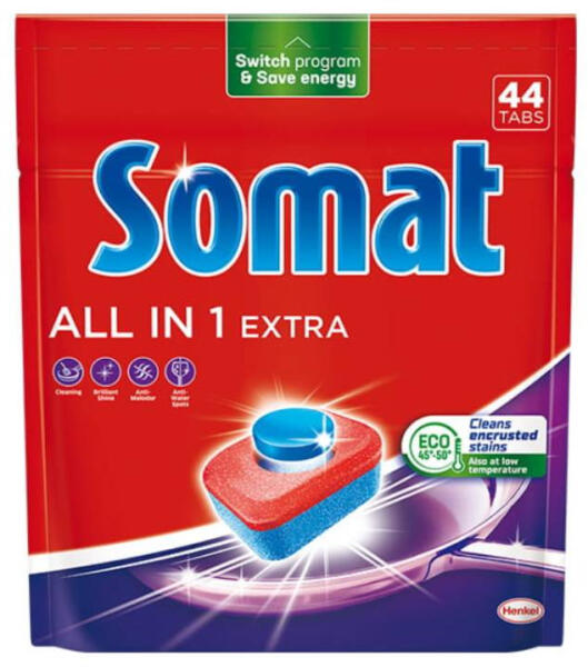 Somat All in 1 Extra: A tiszta edényekért és az odaégett szennyeződések ellen - még alacsony hőmérsékletű Eco vagy alacsony hőmérsékletű rövid mosogatási programok használata esetén is, miközben akár 20% energiát is megtakaríthat. A Somat All in 1 Extra tabletta vízben oldódó fóliában csomagolt, használatához nem szükséges kicsomagolni.