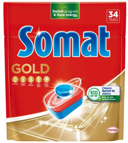 Somat Gold: Erőteljesen lép fel az odaégett szennyeződésekkel szemben még alacsony hőmérsékletű Eco & rövid mosogatási programokban is. A Gold tablettánk egy gyorsan oldódó mosogatószer tabletta, mely vízben oldódó fóliában van, így használatához nem szükséges kicsomagolni.