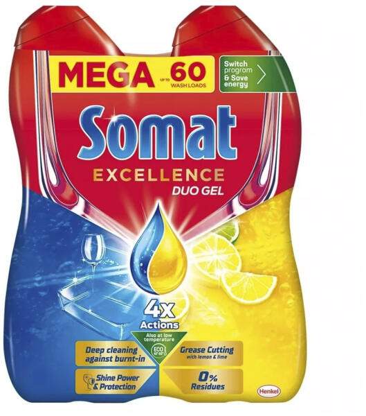 Somat Excellence Duo Gél - a legjobb Somat mosogatógél formulánk, mely hatékonyan tisztít és ragyogó edényeket biztosít, alacsony hőmérsékletű ECO vagy alacsony hőmérsékletű rövid mosogatási programok használata esetén is, melyek során akár 20% energiát is megtakaríthat. Ragyogást és védelmet biztosít a kemény víz okozta foltoktól. Az egyedülálló kétkamrás flakon segítségével a Somat két hatékony formulát egyesít az erőteljes zsíroldóhatás, valamint az odaégett szennyeződések eltávolítása érdekében.