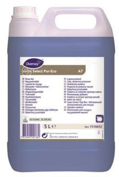 Suma Select Pur-Eco A7 Koncentrált gyenge habzású semleges öblítőszer, mely minden mosogatógéphez ideális megoldás. Az anionos felületaktív anyagok keveréke elősegíti a végső öblítővíz felületi feszültségének csökkentését. Ez megelőzi a cseppképződést, mivel a víz egy vékony rétegben halad, a száradási idő csökken. Előnyök: